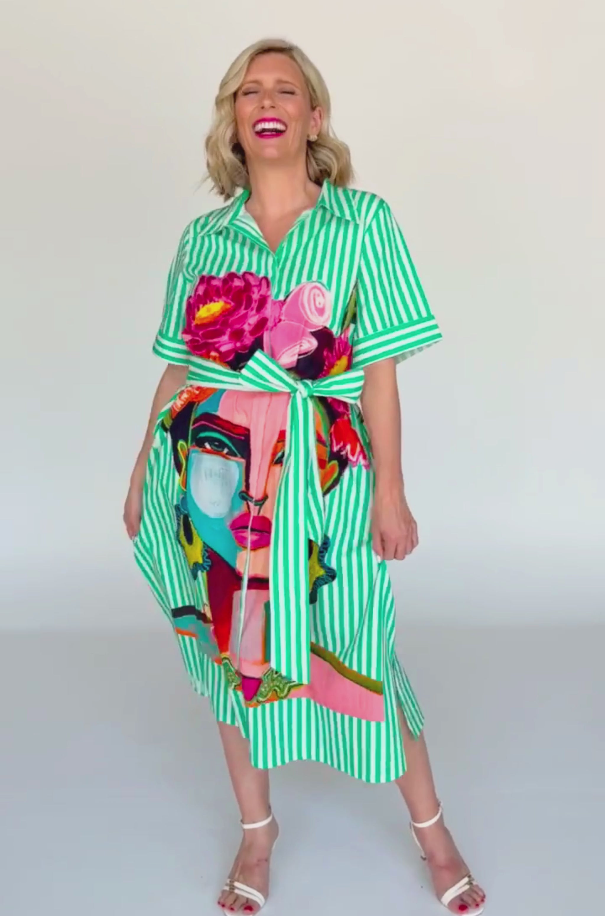Introducing our fabulous Frida Dress in green. Made from 100% cotton, it effortlessly combines playful style with comfort. Featuring a colourful Frida Kahlo print and fabulous green stripe design, this button-up shirt dress also includes a removable belt for added versatility and pockets! Perfect for any occasion.