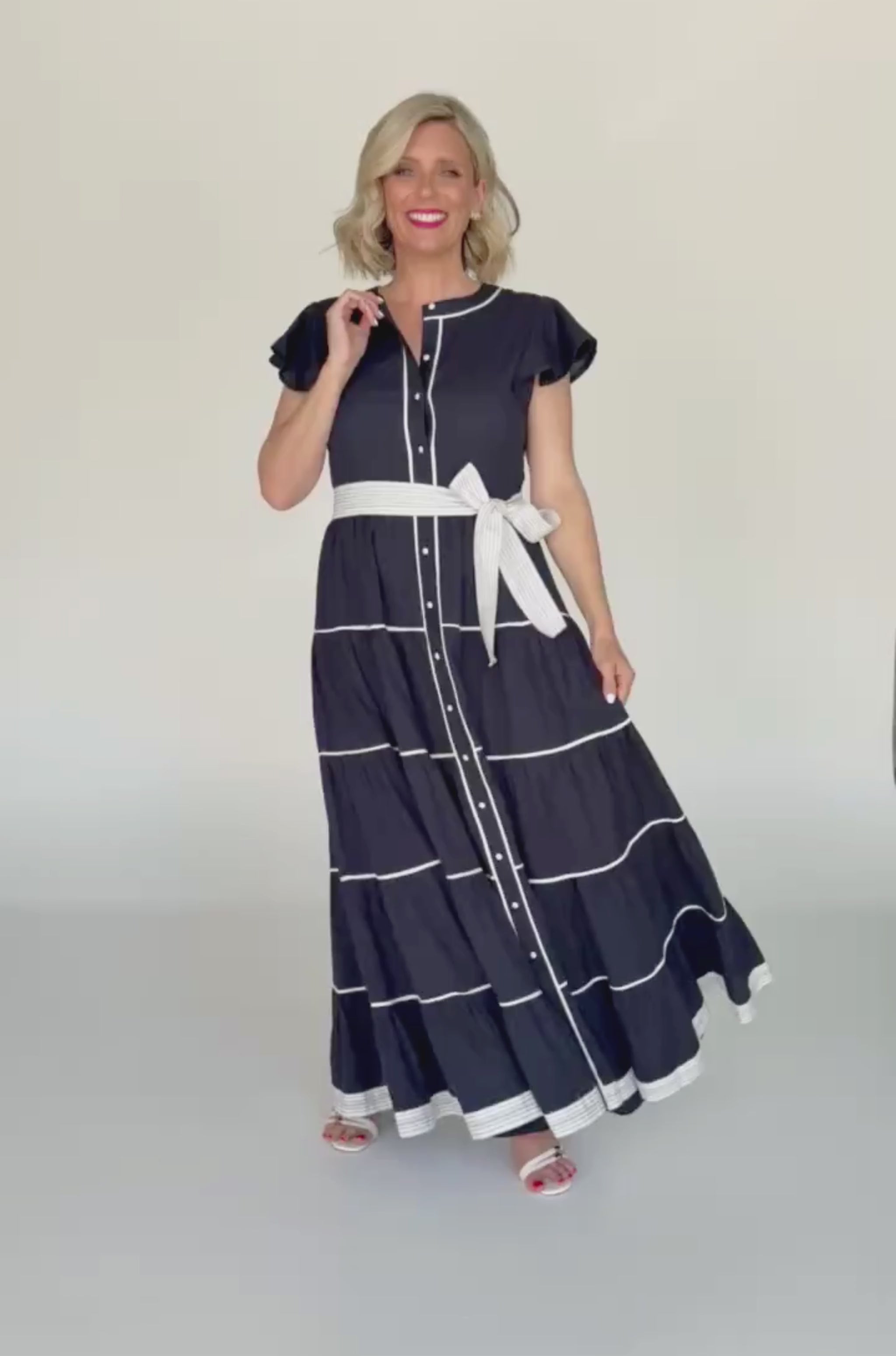 Turn heads in our Lucilla Dress, a timeless navy maxi with white piping and a contrasting white removable belt. Featuring ruffle sleeves, a button-up front, and a beautifully flared full skirt, it’s both elegant and easy to wear.