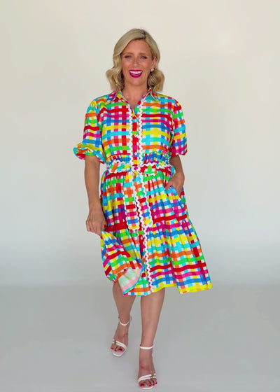 Get ready to turn heads in our Melody Dress! With its bold Neon Gingham design, this midi dress features a button up front, removable belt and puff sleeves and white ric rac for a touch of whimsy. Made from 100% cotton poplin, this gorgeous dress also boasts a beautiful flared skirt, perfect for any occasion.