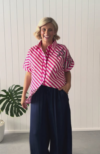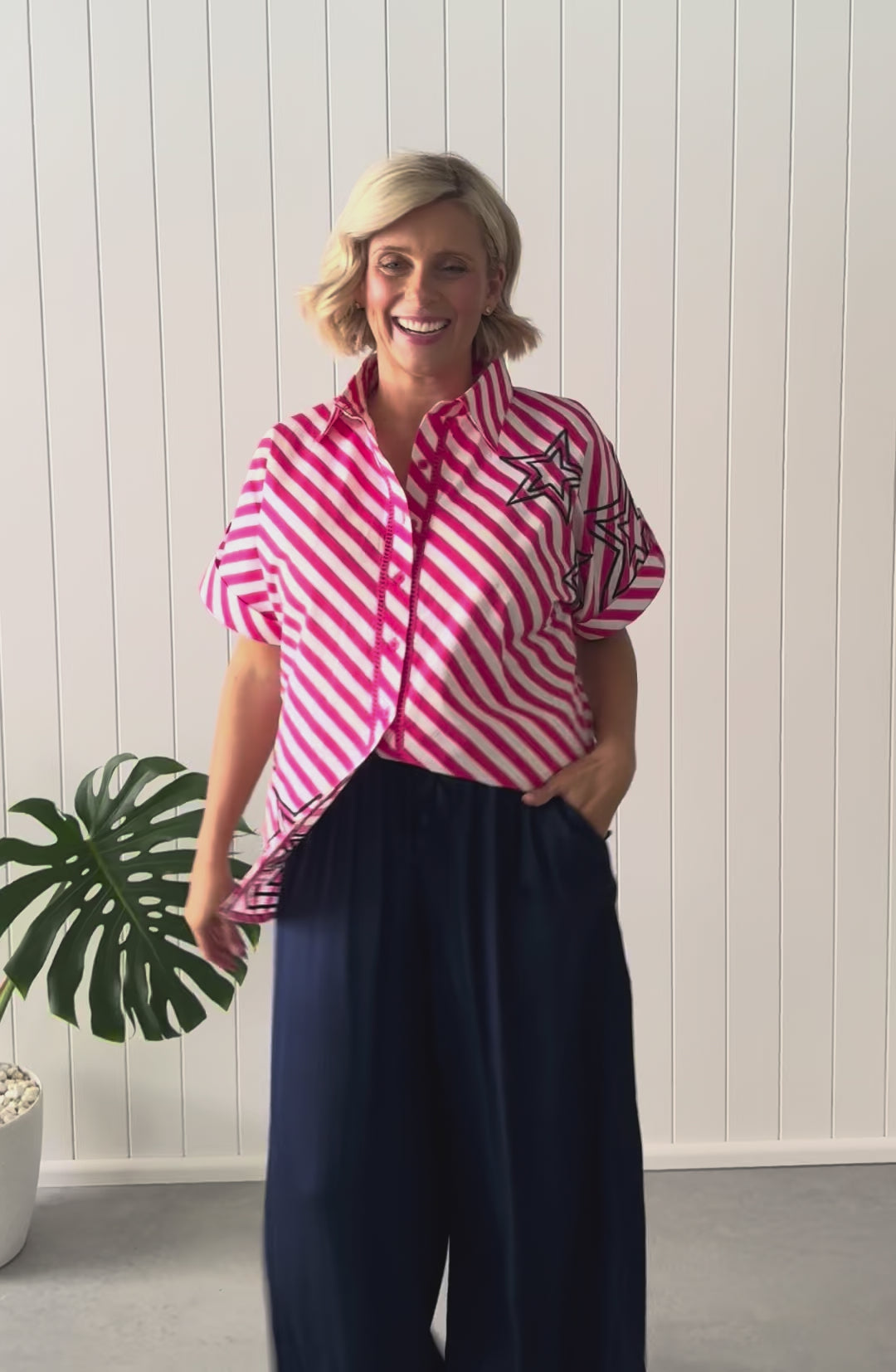 The details are what make Rosie shine. A textured ladder trim along the button front adds a refined finish, while navy embroidered stars scattered at the shoulder and hip bring that unmistakable Liv & Milly personality.
