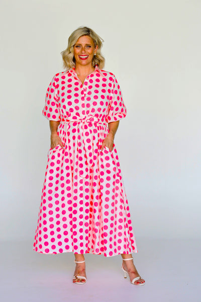 Featuring a classic button-up front, softly structured puff sleeves, and removable belt, the Victoria Dress is designed to flatter. The vibrant neon pink spots on crisp white bring a modern, playful twist to this beautifully tailored piece.